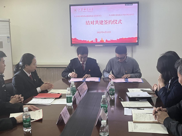 为深化院校合作,推动法治人才培养与司法实践深度融合,共青团江苏师范大学法学院委员会与共青团徐州铁路运输法院总支部委员会于4月15日下午开展了结对共建活动。徐州铁路运输法院党总支书记李宏荣、团总支书记王贺一行,法学院党委书记张明新、党委副书记徐韦华、副院长张杰和学生代表参加了活动。会议由法学院团委书记张杰主持会议。