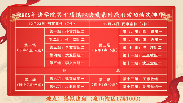 法学院第十届模拟法庭课程展示将于2025年12月23-24日在泉山校区17号楼100B进行,诚邀全校师生莅临观摩指导。