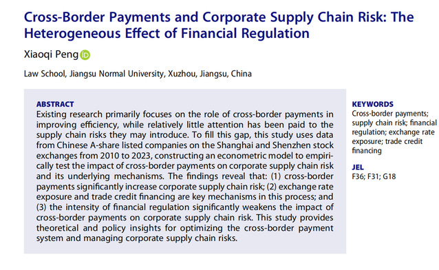 近日,江苏师范大学法学院涉外法治人才培养实验班23法15班学生彭笑其以独立作者身份,在国际核心期刊《新兴市场金融与贸易》(Emerging Markets Finance and Trade,SSCI中科院三区)发表研究论文。该刊是新兴市场研究领域的重要国际期刊,在金融、贸易与经济发展等前沿方向具有较高学术影响力。彭笑其从法经济学视角出发,基于2010—2023年沪深A股上市公司数据构建计量模型,实证检验跨境支付对企业供应链风险的影响及金融监管的制度效能,为优化跨境支付制度安排、完善金融监管法律体系提供了理论支撑与实践启示。