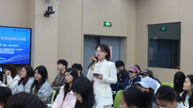 在互动环节,法学院硕士研究生赵丹珺围绕人工智能数据训练合理使用边界、思想表达二分法与合理使用的适用关系、知识产权相关立法完善等问题踊跃提问。现场交流氛围十分热烈,林教授结合理论与实践对提出的问题逐一进行细致解答,进一步厘清了大家的困惑,让在场师生对人工智能与知识产权交叉领域的问题有了更为深入的理解。