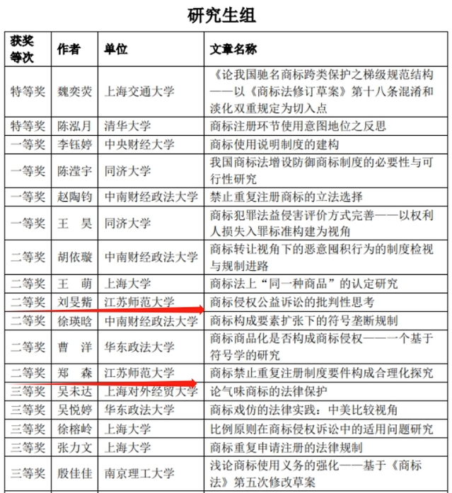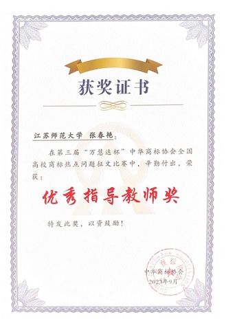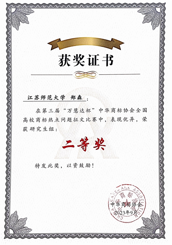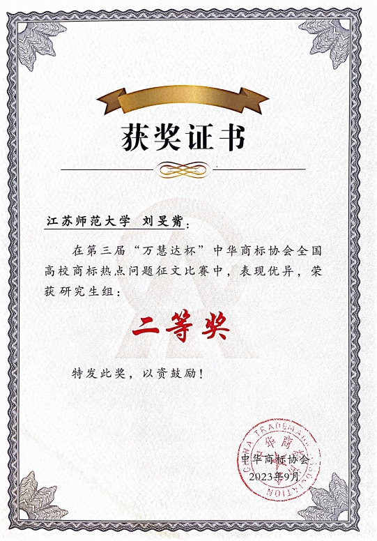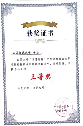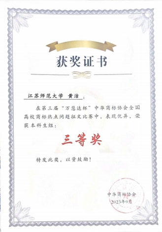 近日,第三届“万慧达杯”中华商标协会全国高校商标热点问题征文比赛获奖名单公布。本次征文比赛的主办单位为中华商标协会,协办单位为万慧达知识产权,承办单位为北京君策知识产权发展研究中心,由《中华商标》杂志社和威科先行提供支持。 组委会共收到了来自全国40所高校的139篇征文,其中本科生组58篇,研究生组81篇,获得三等奖及以上奖项的论文仅有38篇。江苏师范大学法学院积极动员学生参赛,继本年度“万慧达杯”全国高校知识产权热点问题辩论赛后,在学科建设和人才培养方面再创佳绩,获奖的论文有4篇,其中研究生组刘旻觜和郑森获二等奖。本科生组曹刘颖和黄洁获三等奖,同时,我校张春艳老师荣获优秀指导教师奖。