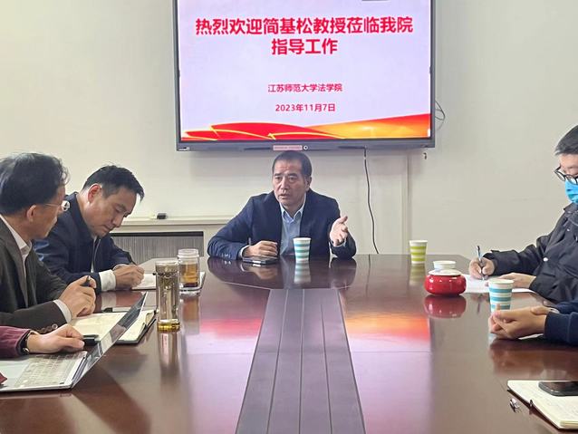 2023年11月7日下午,中南财经政法大学法硕中心主任、博士生导师简基松教授应邀到江苏师范大学法学院开展关于涉外法治人才培养、法律硕士培养的座谈,并于当晚作了题为“涉外经营中的经济制裁问题”讲座。