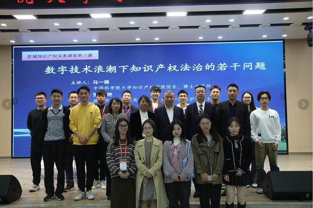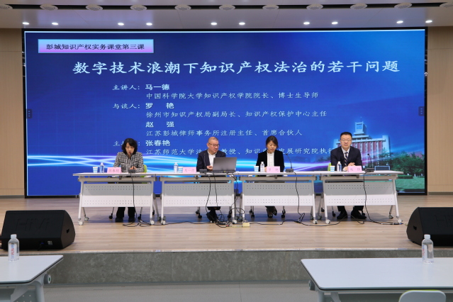 2023年11月4日上午,中国科学院大学知识产权学院院长马一德教授应邀来我校做客彭城知识产权实务课堂第三讲。讲座主题为“数字技术浪潮下知识产权法治的若干问题”。徐州市知识产权局副局长罗艳、江苏彭城律师事务所注册主任、首席合伙人赵强参加与谈,江苏师范大学知识产权发展研究院执行院长张春艳教授主持讲座。本次讲座由江苏师范大学人文社会科学研究院和江苏师范大学法学院主办,江苏师范大学知识产权发展研究院承办,江苏彭城律师事务所协办。江苏彭城律师事务所合伙人李想及法学院部分老师、学生参加了讲座。