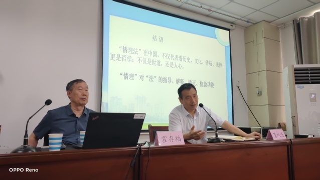 接着,霍存福教授谈论了自己研究“情理法”各个阶段的成果:第一阶段,1990年通过研究沈家本法律思想初识“情理法”。霍教授概括总结出“情理是法律的内容”“情理是法律的基础”;第二阶段,2001年发表《中国传统法文化的文化性状与文化追寻——情理法的发生、发展及其命运》。霍教授指出,“情”起初指客观案情,后来认为法律不外乎“人情”,法律的依据、法律的精神就是“情理”;第三阶段,2008年发表《“合情合理,即是好法”——谢觉哉“情理法”观研究》,注意到“情”的主观内容。霍教授称谢老“合乎情的未必合理,合乎理的定合乎情。不合乎理的情,由于有所蔽。“理”是经过了洗炼的情”的论述,使自己加深了对“情、理”关系的理解。随后通过《乔太守乱点鸳鸯谱》的案例进一步阐释情、理、法之间的关系;第四阶段,2012年发表《沈家本眼中的“情·法”结构与“情·法”关系——以〈妇女离异律例偶笺〉为对象的分析》。霍教授提出“法”是规范中的原则性部分,“情”是规范中“但书”的补充规定。“情”分主观、客观,也分案内、案外;第五阶段,霍教授博览各朝代各大家的见解,引经据典,与沈家本、樊山等人的观点论断进行比较研究,对“情法”关系有了新的认识。