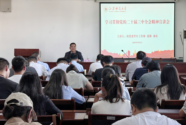 9月25日下午,法学院在16号楼602报告厅举办“学习贯彻党的二十届三中全会精神”宣讲会,校宣讲团成员、党委学生工作部范锋部长做宣讲报告。院领导班子全体成员、全院教师党员和学生党员代表参加了此次宣讲会。院党委张明新书记主持宣讲会。