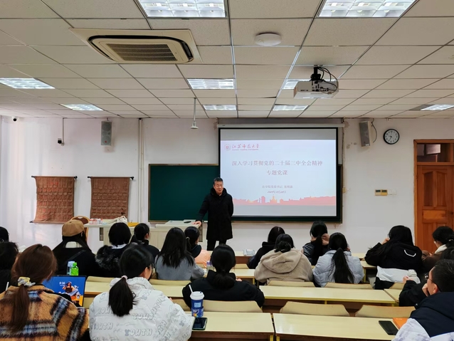 首先,张明新书记介绍了党的二十届三中全会的背景和意义,表示这是一次在全面深化改革、推进中国式现代化进程中的关键会议。张明新书记还详细解读了《中国共产党第二十届中央委员会第三次全体会议公报》和《中共中央关于进一步全面深化改革、推进中国式现代化的决定》等重要文件。他提出,要把学习、宣传、贯彻党的二十届三中全会精神作为当前和今后一个时期的重大政治任务,紧密结合法学院的工作实际,充分发挥专业优势和资源,持续深化科研和人才机制建设,提升科研创新组织化协同化水平,健全科研评价体系和考核机制。同时,张明新书记还着重阐述了党的二十届三中全会精神的核心要义和实践要求。现场同学认真聆听、积极思考,纷纷表示将以此次党课为契机,进一步加强对党的二十届三中全会精神的学习和理解。